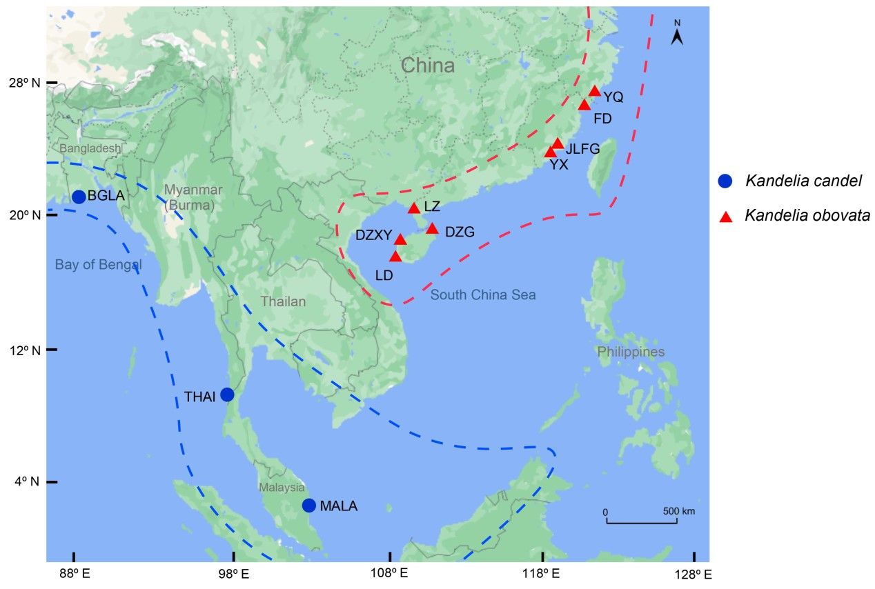 秋茄是我国分布最广泛、最耐寒的滨海树种,也是我国东南沿海主要的红树林人工造林树种之一,在我国 “南红北柳”生态工程建设中发挥着重要作用。秋茄是红树科秋茄树属植物,最初认为秋茄树属只有一个种,并根据其胚轴繁殖体形象蜡烛(candle)而命名为Kandelia candel。 2003年,台湾和新加坡学者根据植物形态结构、染色体数目差异等,将分布于中国南海东北部的秋茄鉴定为一个新种,基于其倒卵形(obovate)的叶片特征命名为Kandelia obovata种,两个种之间生态适应的差异主要表现在耐冷性方面,但以中国南海为界分布的两个姊妹种在基因水平的差异及其生态适应的分子机制尚不明晰。