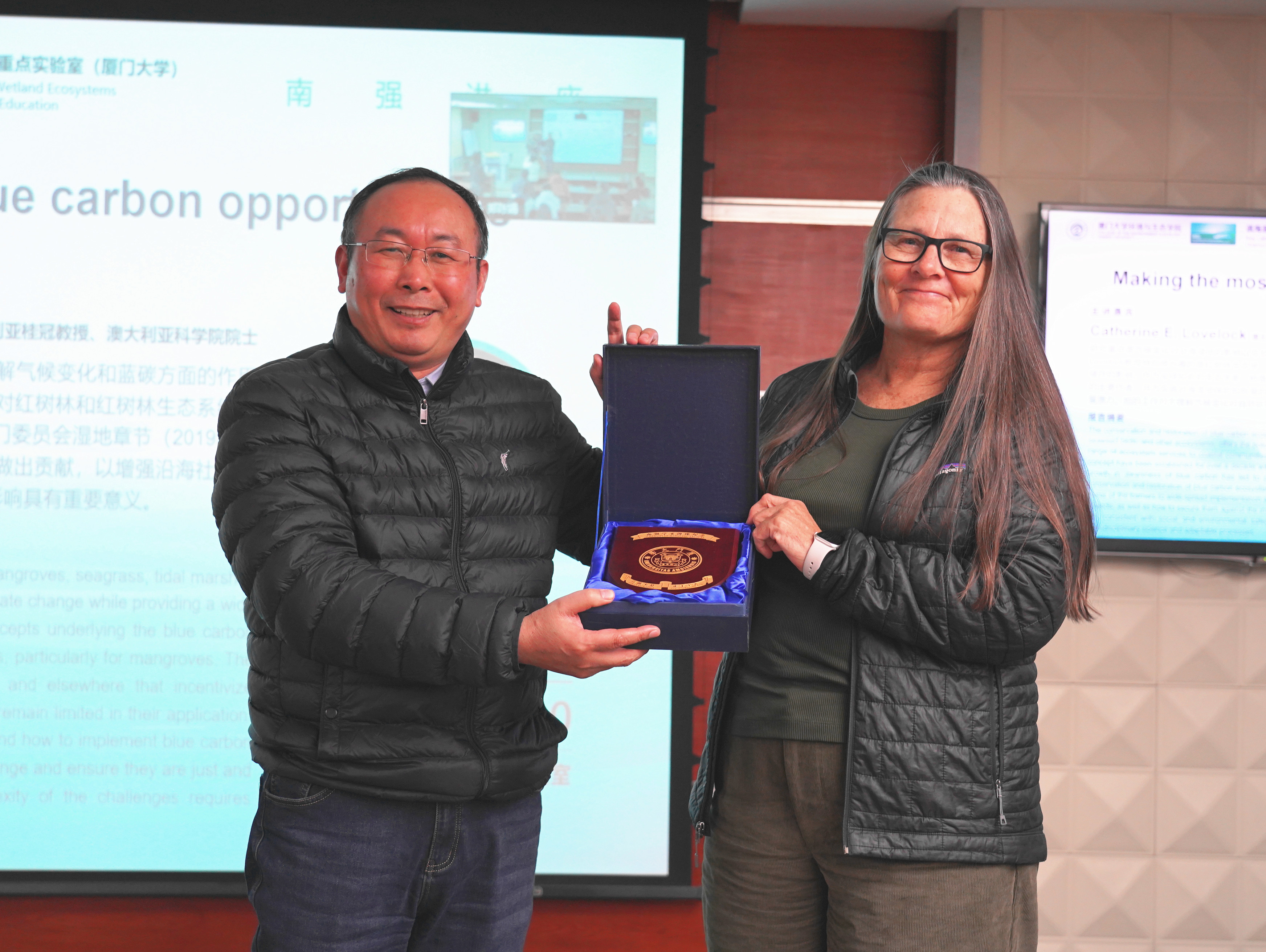 2024年1月23日下午,国际知名专家、昆士兰大学教授、澳大利亚桂冠教授、澳大利亚科学院院士凯瑟琳·洛夫洛克做客厦门大学“南强学术讲座”,在厦门大学环境与生态学院A239为师生带来题为“充分利用蓝碳机遇”的专题学术讲座。