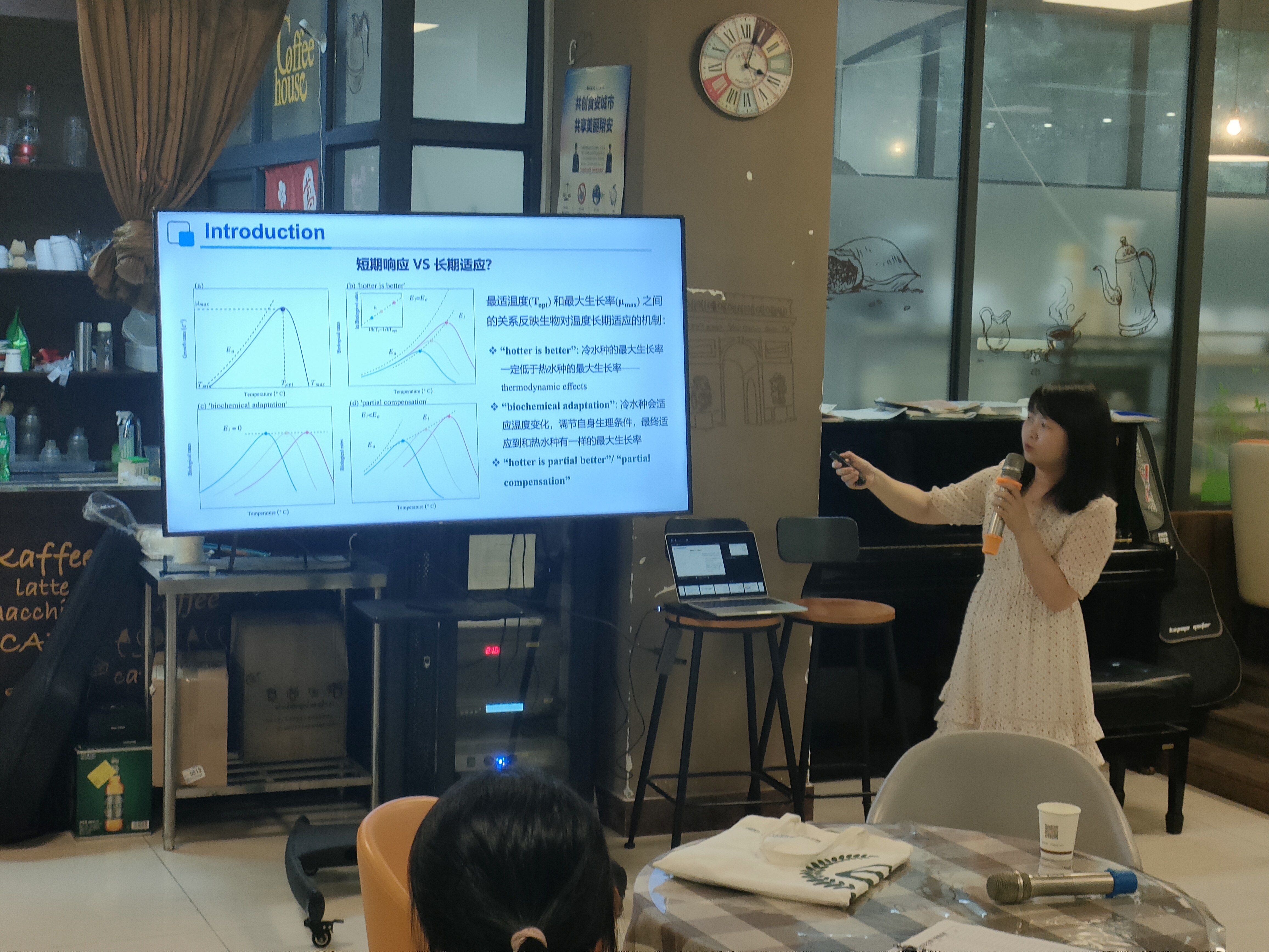 接着,刘凯琳以自己的研究方向为切入点,阐述了在气候变化背景下海洋浮游生物对温度的响应特征和机制。她认为,海洋浮游植物对于海洋生态系统具有不可忽视的重要意义,作为生物泵的关键组分和过程载体,研究海洋浮游食物网以及生物泵如何响应海洋暖化具有现实意义。刘凯琳以生态学代谢理论等理论为指导,开展大量航次观测、船基培养实验,并利用统计建模探究了海洋浮游生物对温度的“自养小于异养”“长期适应”“资源限制”三大适应特征。她总结了自己迄今的研究工作成果,提出了面临的局限性,并展望了未来在该领域开展更多深入和创新性的工作。