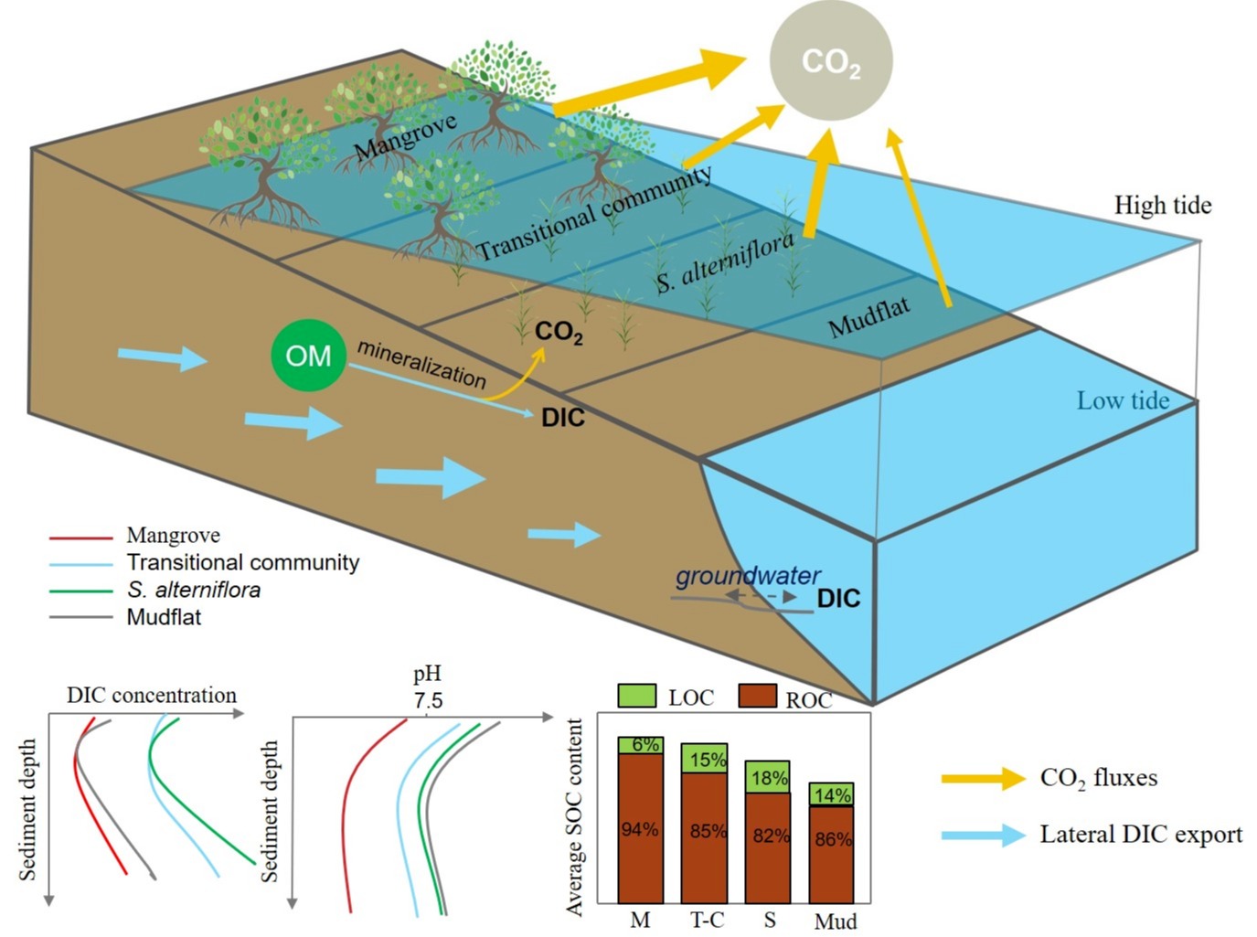 红树林在净化海水、防风消浪、固碳储碳、维护生物多样性和调节气候变化等方面发挥着重要作用,有“海岸卫士”“海洋绿肺”之美誉。红树林是海岸带重要的“蓝碳”生态系统之一,拥有极高的固碳与储碳“超能力”。与美国盐沼湿地受红树林入侵现象不同,我国南方滨海湿地普遍存在互花米草入侵红树林湿地现象。由于互花米草具有较高的耐盐和耐厌氧环境特性,表现出较强的繁殖和竞争力,可与原生红树林生态系统产生竞争关系形成典型的红树林-盐沼生态共生格局。截止目前,关于互花米草入侵如何改变红树林湿地沉积物碳循环形态和无机碳横向输出,还缺乏清晰的认识。