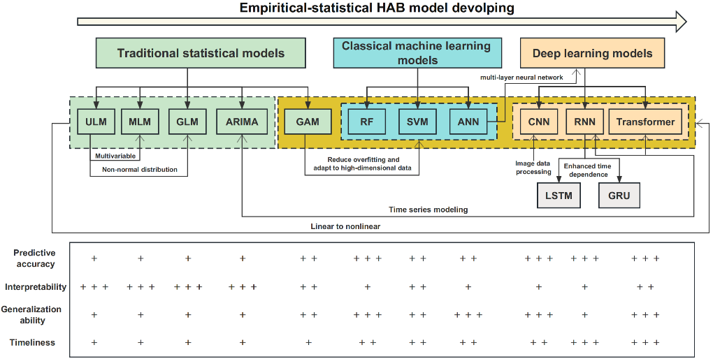 经验统计模型通过统计方法量化藻华强度、频率等指标与驱动因素的关系。除了提供像概念模型的描述性解释以外,经验统计模型可以根据观测数据对藻华的发生和规模进行较精确的定量化预测。这些统计方法包括传统的线性模型、广义线性模型,数据驱动的随机森林、人工神经网络等机器学习方法和卷积神经网络、循环神经网络等最新的深度学习方法。与传统统计模型相比,机器学习尤其是深度学习模型表现出更强大的预测能力,不仅提高了对藻华预测的准确性,还提高了预测的时效性。
