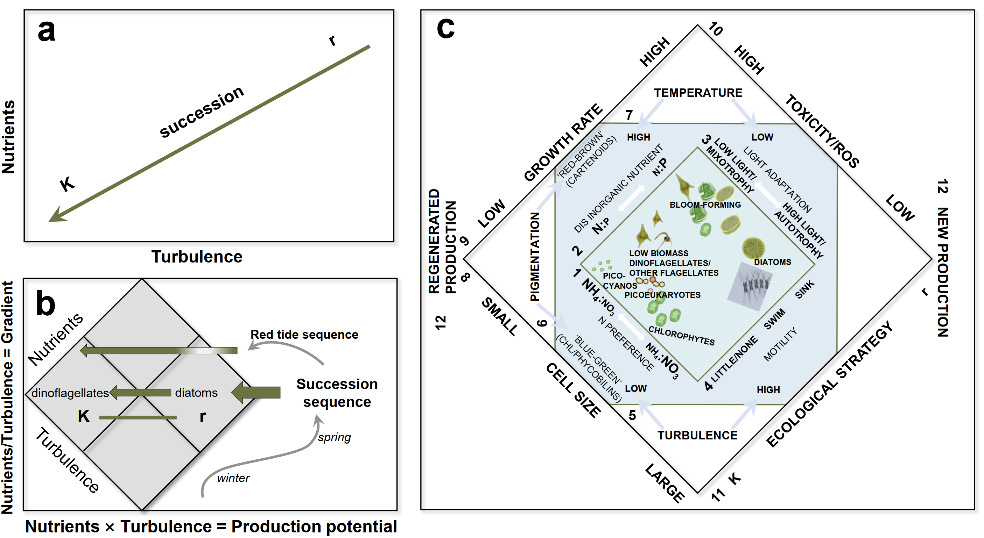 概念模型利用浮游植物对光、温度和营养盐等环境因素的响应来描述藻华种的栖息地、生活史、养分利用和防御策略等特征,如经典的Margalef's Mandala和新兴的生态位周期表等概念模型。这些模型旨在将藻华观测结果综合成系统的连贯描述,提供藻华物种适应环境的描述性解释或定性预测。
