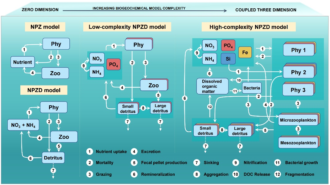 机理模型使用一系列偏微分方程描述藻华物种的生命周期和行为策略,通过求解方程获得描述藻华动态的时间曲线。机理模型整合了海洋生态系统的生物地球化学过程,往往还耦合了物理过程。因此,通过详细的过程模拟提供了对藻华物理动力学和生态动力学的深入理解。
