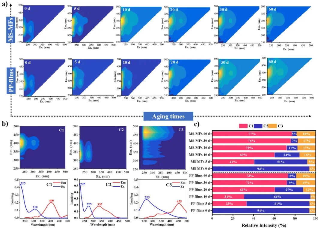 图3 (a)DOM-MS-MFs和DOM-PP-films的3D-EEM;(b)EEM-PARAFAC显示三种不同的荧光成分和相应的激发/发射光谱;(c)DOM的三组分随老化时间的变化