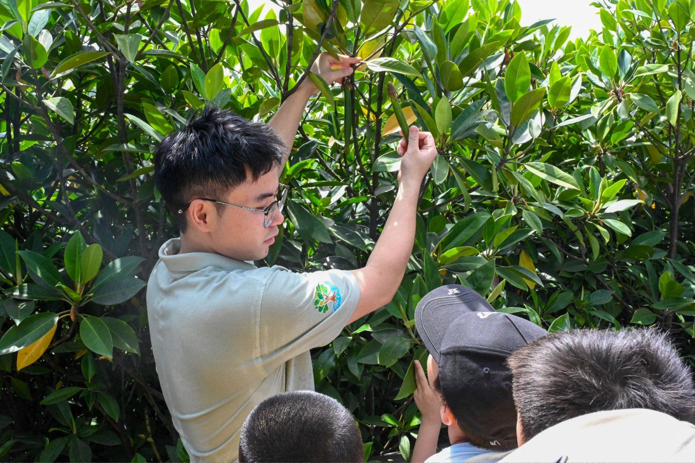参与者们分组前往保护区红树林栈桥和育苗基地进行野外实践。在红树林栈道,同学们认真学习秋茄、木榄等红树植物的特征,观察它们独特的根系和叶片,了解红树植物如何适应高盐、缺氧的潮间带环境;在育苗基地,大家详细了解红树植物的生长繁殖过程,看着一株株幼苗,仿佛看到了红树林未来的希望。在亲身观察与体验中,同学们进一步加深了对红树林生态系统的认识与理解,也更加坚定了保护它们的决心。