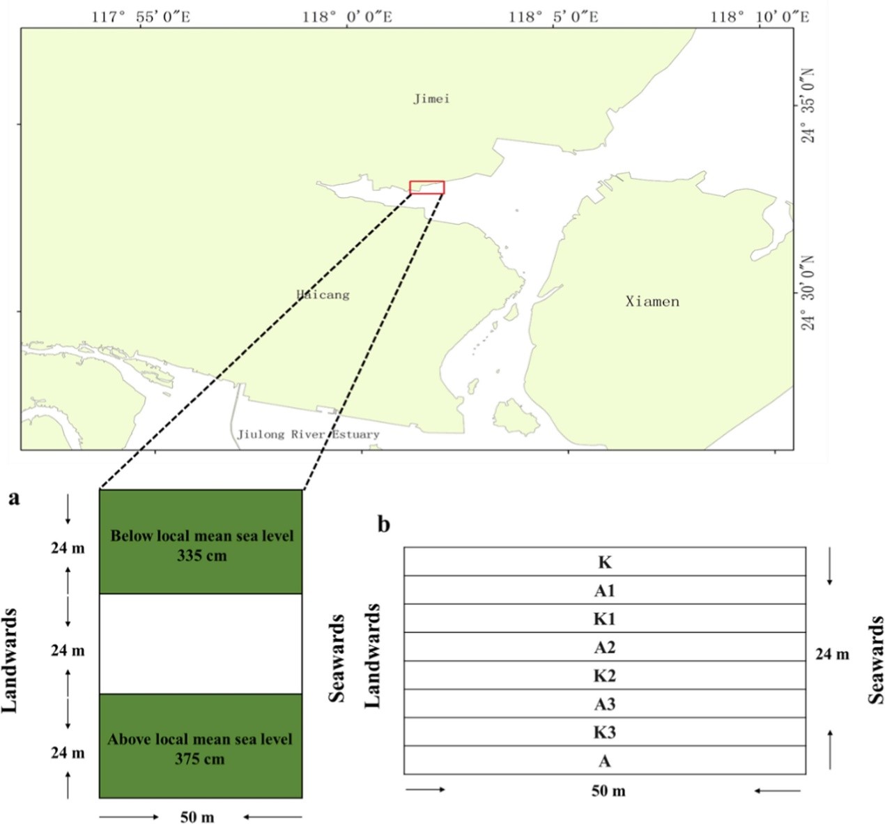 Maps of the study area. (a) distribution of the two elevation sites (the site below local mean sea level and the site above local mean sea level), (b) planting pattern of A. marina and K. obovata seedlings in each of the two elevation sites. A, A1, A2 and A3 represent plots growing A. marina (A1, A2 and A3 are three replications at each site). K, K1, K2 and K3 represent plots growing K. obovata (K1, K2 and K3 are three replications at each site). A and K are discarded in consideration of edge effects.