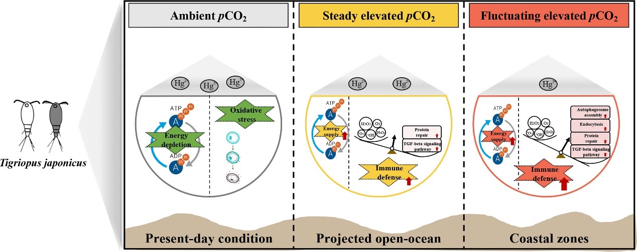 Schematic illustration of the key molecular processes occurring in Hg-treated Tigriopus japonicus under different pCO2 conditions (ambient pCO2, steady elevated pCO2, and fluctuating elevated pCO2).