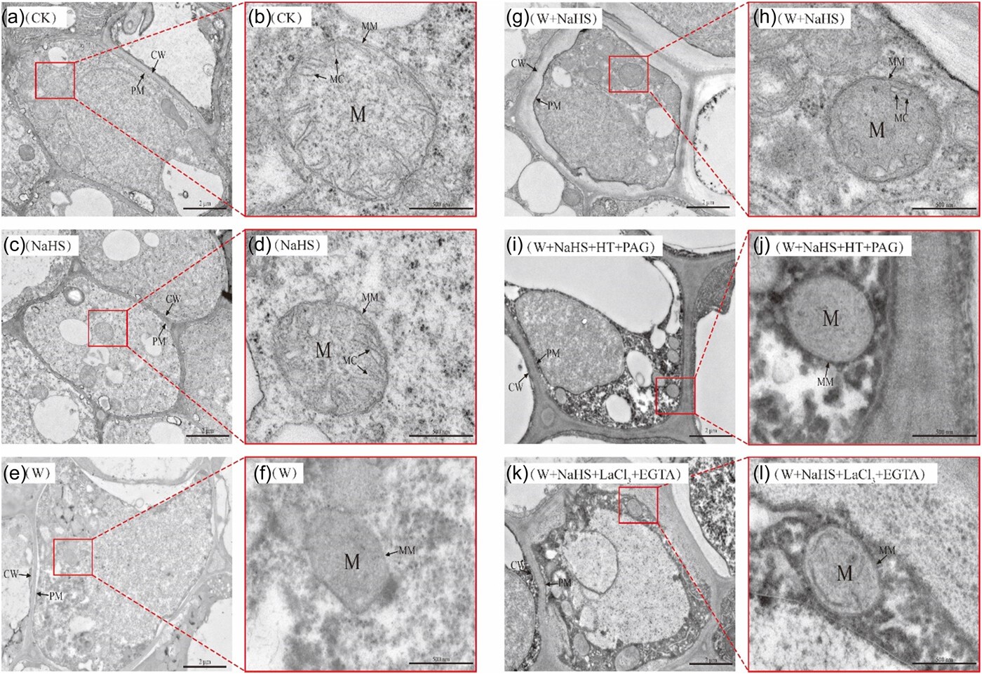 Transmission electron microscope observation of A. marina seedling roots treated with different NaHS under 24-h waterlogging. (a, c, e, g, i, k) The ultrastructure of mitochondria in the root tip cells under low magnifications. Bars in a, c, e, g, i and k represent 2 μm. (b, d, f, h, j, l) The ultrastructure of mitochondria in the root tip cells under high magnifications. Bars in b, d, f, h, j and l represent 0.5 μm. CW, cell wall; PM, plasma membrane; M, mitochondrion; MC, mitochondrial cristae. Other abbreviations are as same as in Figure 3. [Color figure can be viewed at wileyonlinelibrary.com]