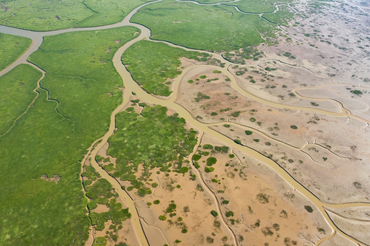 Spartina alterniflora is already the most dominant plant in China's coastal wetlands. Here it is seen sweeping through the mudflats and salt marshes of the Yellow River Delta (credit: Qiang He).