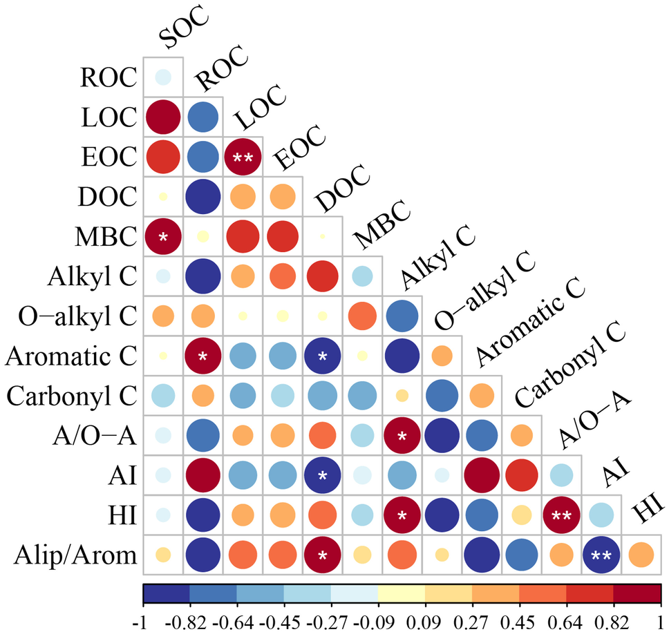 Correlations among the SOC fractions, compositions, and stability indices. *p < 0.05, **p < 0.01