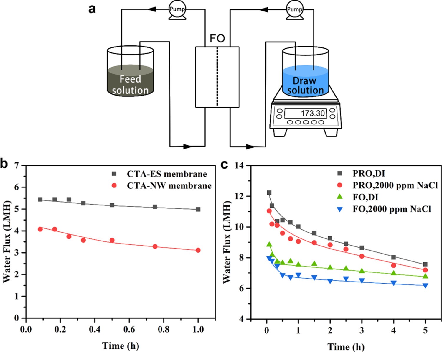 Schematic illustration of the FO process and water flux of different membranes and running modes. (a) Schematic illustration of the FO process with polyelectrolyte solution as a draw agent. (b) FO water flux of CTA-ES and CTA-NW FO membrane with 20 wt % PDDA (MW < 100 kDa) as draw solution and DI water as feed solution. (c) Water flux of 20 wt % PDDA (MW < 100 kDa) solution under different running modes.
