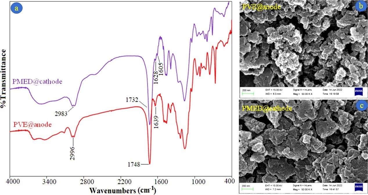 (a) FT-IR spectra of PVE@anode and PMED@cathode; (b) SEM image of PVE@anode; (c) SEM image of PMED@cathode.