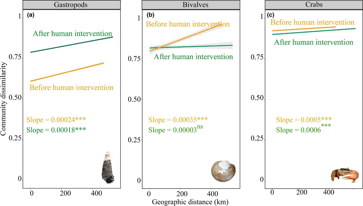 4. After the large-scale anthropogenic mangroves, we found species richness of gastropods, bivalves and crabs increased by 23.81%, 100% and 20%, respectively. The distance-decay effects of gastropods and bivalves decreased by 25% and 91.43%, while that of crabs remained virtually unchanged, which mediated by increased dispersal rate of macrobenthos. With mangrove plantation, compositional similarity of crab and bivalve assemblages increased by 28.57% and 38.46%, suggesting that large-scale monospecific planting exacerbate biotic homogenization. Altogether, these results indicate that large-scale anthropogenic habitats increase the diversity of mangrove macrobenthos and change taxonomic compositions by reducing distance-decay effects and increasing dispersal rate of macrobenthos.
