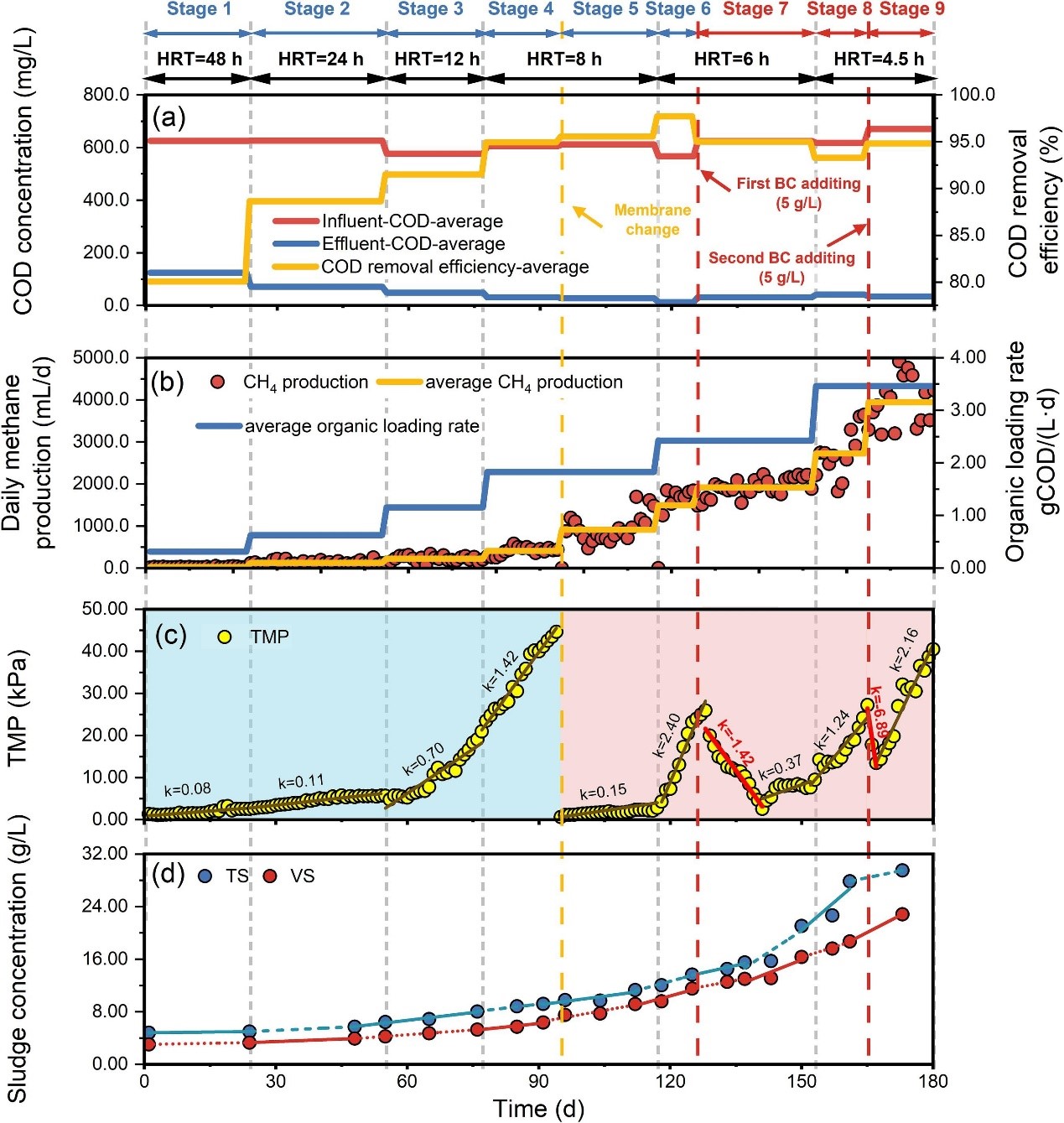 Long term performance of the AnMBR. COD removal rate (a); Daily methane yield and daily average methane yield (b); TMP variation and foulant rate (c); Sludge concentration of total solids and volatile solids (d).