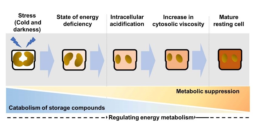 硅藻作为海洋生态系统中的关键光合自养生物,通过光合作用迅速生长,对全球碳循环和海洋生态平衡发挥着重要作用。然而,硅藻在其生命周期中常面临低温黑暗等不利环境,如硅藻赤潮后期或遭遇环境胁迫时,它们会被迫沉入无光且低温的海洋深处或沉积物中。令人惊奇的是,部分沉积物中的硅藻能够长期存活,甚至在多年后环境条件恢复适宜时重新生长。这一现象与硅藻形成休眠细胞的能力密切相关,但关于硅藻如何调控细胞进入休眠状态的具体机制,科学界一直缺乏深入的理解。因此,揭示硅藻休眠细胞的形成机制对于理解硅藻的生态适应性和生态竞争优势具有重要意义。