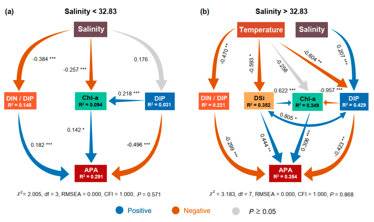 环境因子对APA的影响。结构方程模型(SEMs)展示了盐度在32.83以下(a)及超过此临界点(b)时,盐度、温度、溶解无机氮(DIN)、溶解无机磷(DIP)、溶解硅(DSi)、DIN/DIP比值、叶绿素a(Chl-a)与碱性磷酸酶活性(APA)之间直接和间接关系。R2代表模型解释的方差比例。蓝色和橙色箭头分别表示显著的正相关和负相关关系