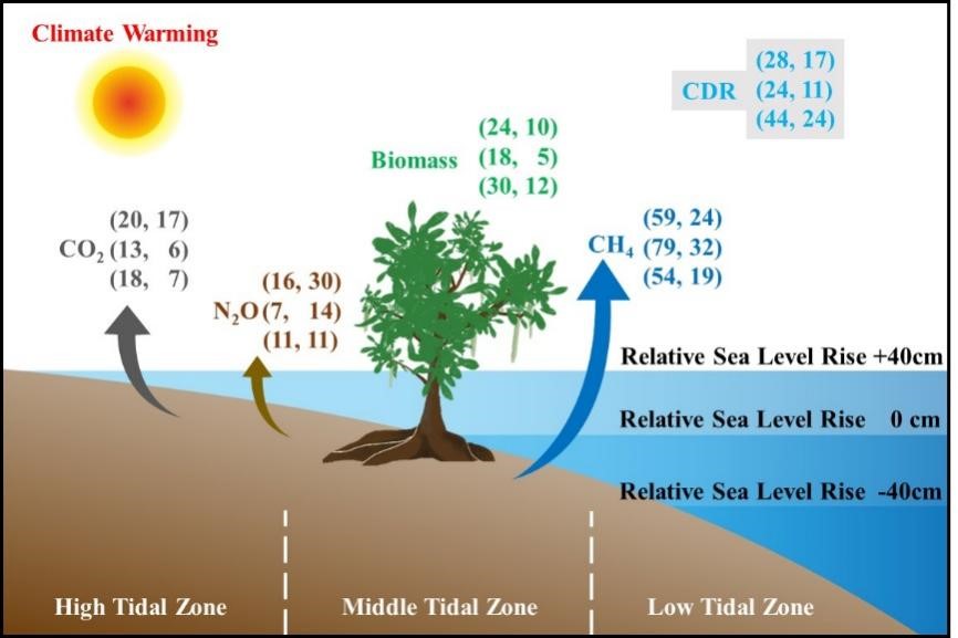 本研究表明,气候变暖使秋茄的生物量固碳增加了至少18%,也使沉积物温室气体的全球升温潜能值增加了13%以上。此外,海平面上升直接影响了对沉积物温室气体排放至关重要的驱动因素,如沉积物温度、pH值以及C、N和S含量,从而间接控制了温室气体通量。位于目前分布北界的秋茄群落有望在未来气候变暖和海平面上升的条件下存活。在目前情景下,秋茄群落预计将额外排放13-20%的二氧化碳、54-79%的甲烷和7-16%的氧化亚氮。未来增温和海平面上升情境下,秋茄群落的CO2清除量(或者冷却效应)将增加24%以上。